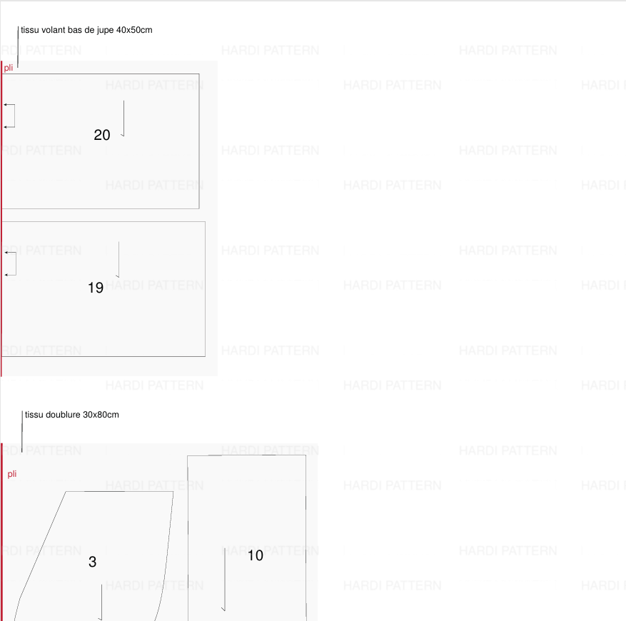 Choisissez le tissu que souhaitez et coupez les pièces du patron dans celui-ci grâce au plan de coupe fourni.