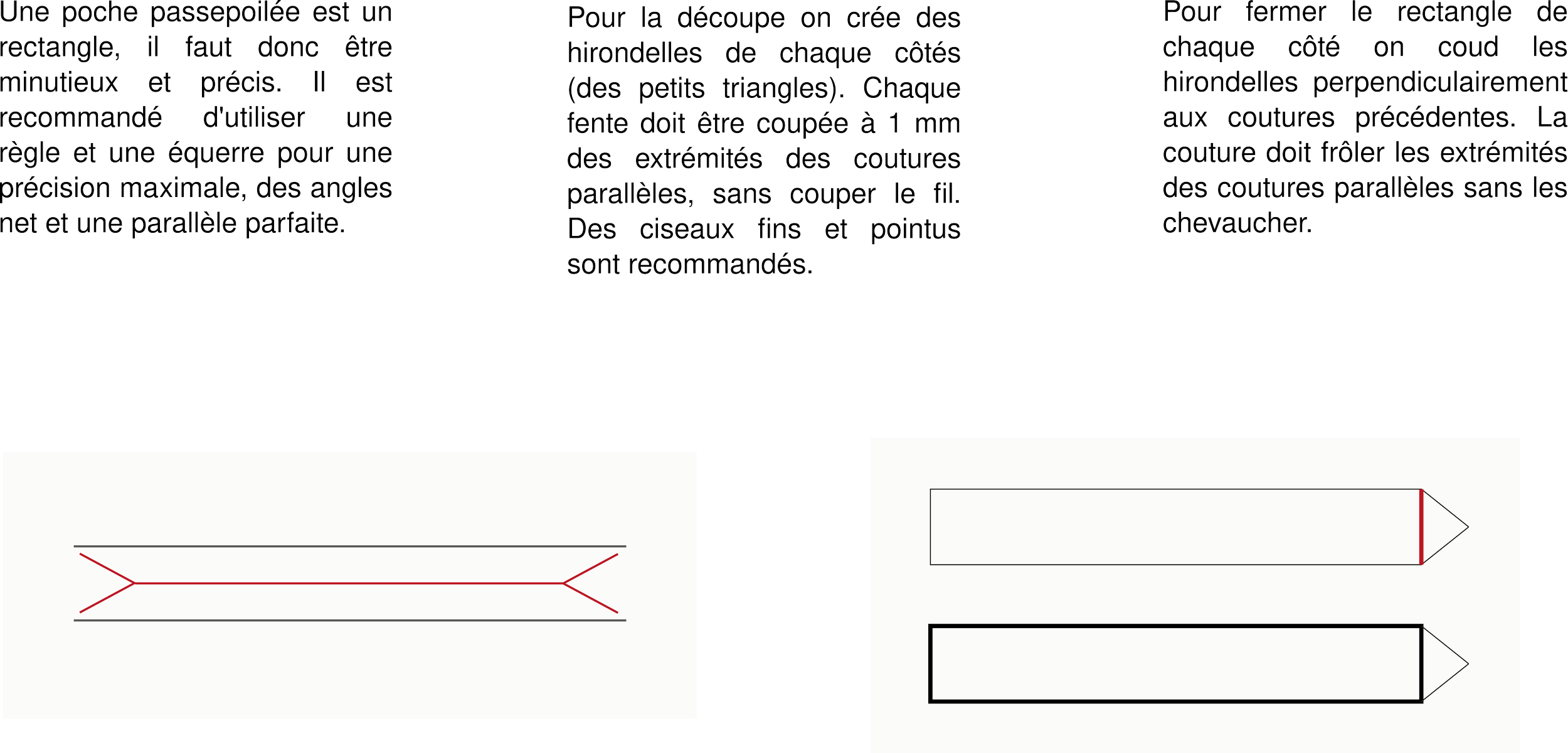 La poche passepoilée est composée d’une pièce principale, un passepoil, une petite entrée de poche, une grande entrée de poche et un fond de poche. Ces éléments peuvent varier selon le type de poche passepoilée.